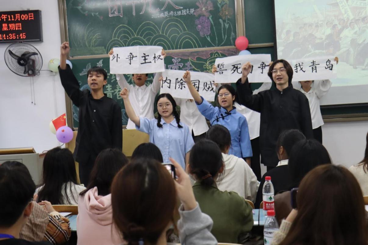 本次团日活动以班团支部为单位开展,主持人引出本次活动主题后,各团支部有序开展团日活动。首先由2021级英语师范第二团支部组织开展。活动开始,主持人带领全体人员合唱共青团团歌。接着该支部通过形式多样的活动,鼓励各同学在新时代敢为人先,努力奋斗。接着由2022级英语师范第八团支部组织学习。该支部团支书从视频“青春是什么样”切入,带领同学们重温党史和宣读入团誓词。同学们通过慷慨激昂的情景剧表演,淋漓尽致地展现出了五四青年强烈的爱国之情和不屈的反抗意识。在党政热词的双语解读下,同学们也明白了学习外语的意义。
