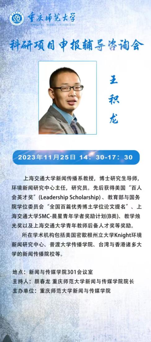 为加强我院教师科研能力,推进科研项目申报工作,11月25日下午,上海交通大学媒体与传播学院王积龙教授应邀来我院,为教师作科研项目申报辅导。会议在学院楼301会议室召开,院长颜春龙副院长赖黎捷、我院部分教师及研究生参会,院长颜春龙主持会议