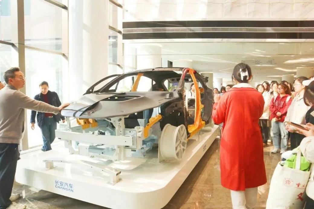 在专业讲解员的引导下,同学们进入全球研发中心以及智能工厂车间,开始了有序地参观。数字化组装线上一台台机械手臂不断舞动,AGV小车来回穿梭,一辆辆新能源汽车陆续下线。同学们在参观过程中认真聆听讲解,不时驻足细观展出的高尖科技,近距离、沉浸式感受着长安集团的汽车产业“换挡提速”的新变化和新风采。