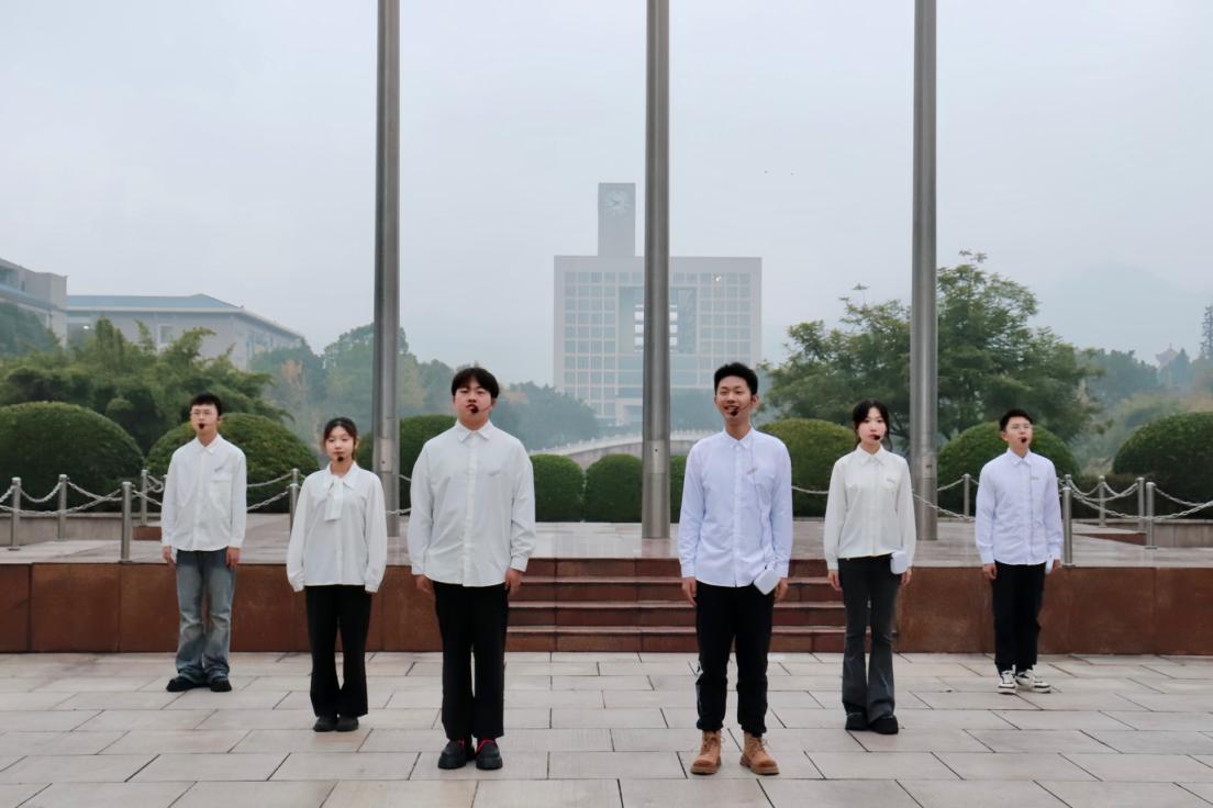 宣誓毕,在蒋欣蕾同学的指挥下,全体师生合唱《没有共产党就没有新中国》,嘹亮激昂的歌声响彻广场,师生们以歌声来致敬伟大的党、伟大的祖国。振奋人心的合唱中,蕴藏着师生对党和国家的热爱,也蕴含着对祖国繁荣昌盛的祝福与期盼。
