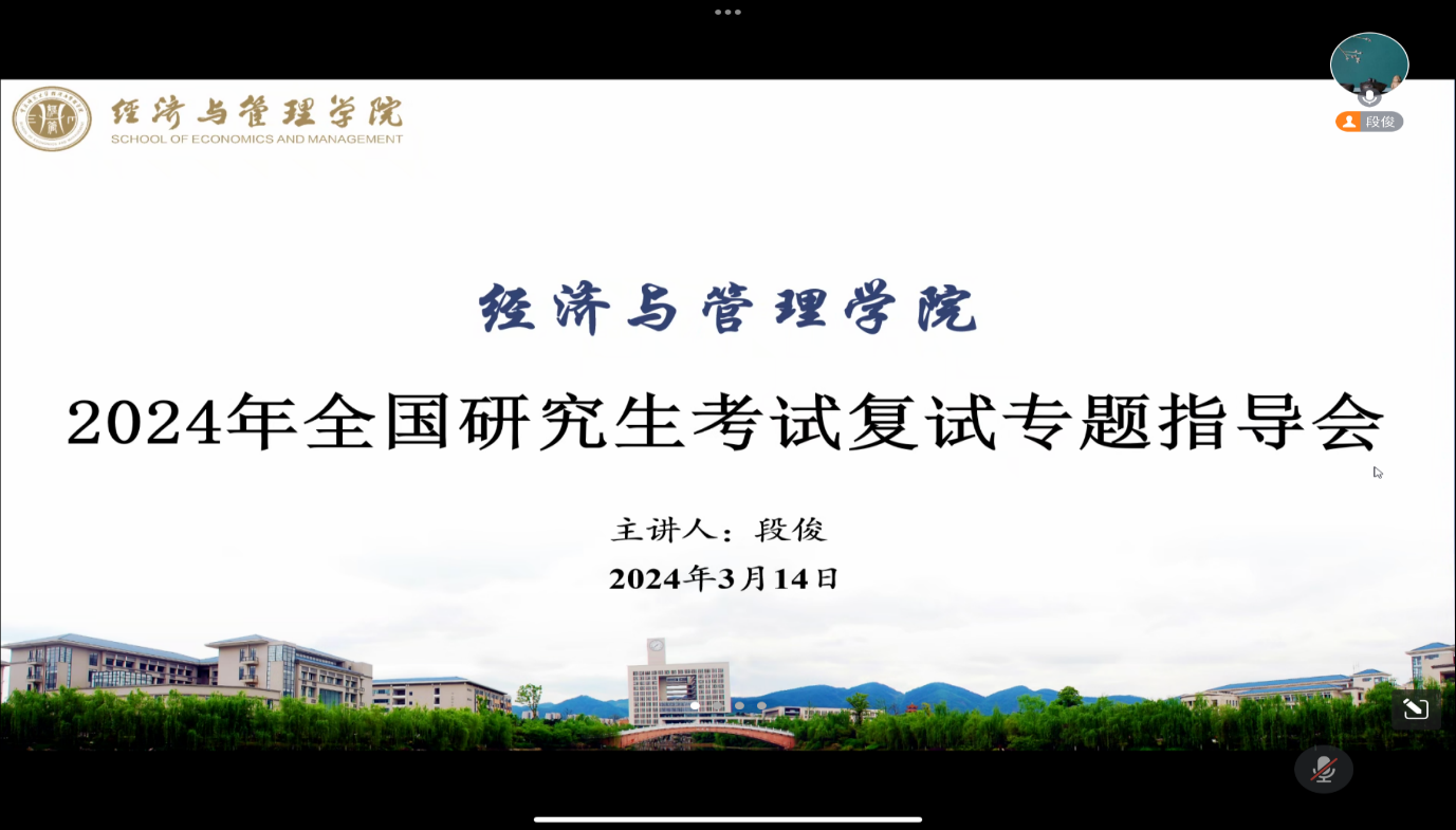 为扎实推进考研复试指导,帮助同学们掌握复试技巧,助力经济与管理学院学子在复试中取得优异成绩,2024年3月14日下午三点,经济与管理学院组织开展了2024年全国研究生考试复试专题线上指导会,会议邀请了经济与管理学院教授段俊担任主讲人作专题指导。
