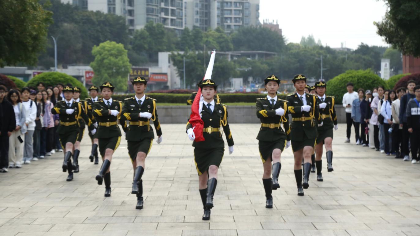 国旗护卫队带着青年人蓬勃的朝气,迈着整齐有力的步伐,目光坚定、神情肃穆地护卫国旗入场;随着国歌的奏响,鲜艳的五星红旗徐徐上升,全场人员庄严肃立,齐唱国歌,并以崇高的敬意向国旗行注目礼。随后,学院党委书记钟敏作国旗下的讲话。