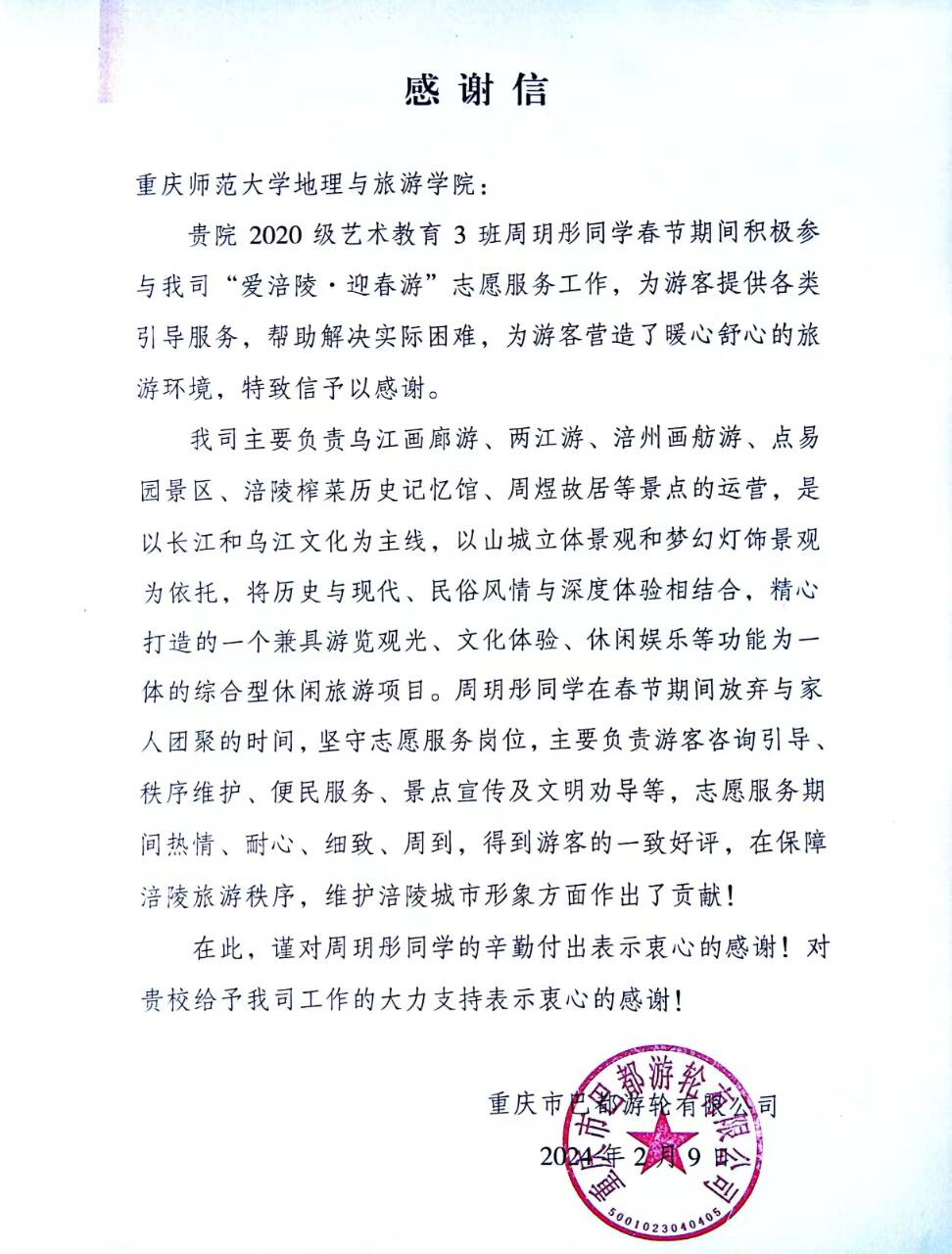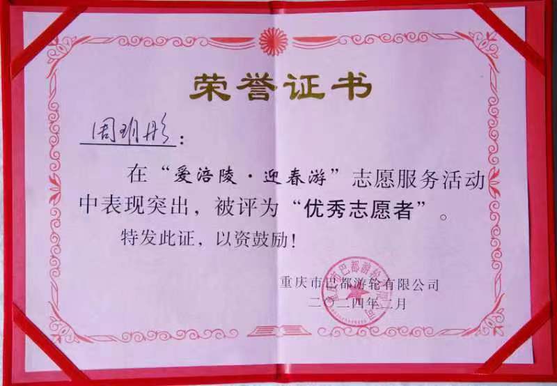 周玥彤同学热情、细致和耐心,为游客提供了专业的服务帮助游客解决了许多实际困难,为春节期间涪陵的旅游事业贡献了自己的力量。她在工作中展现出超凡的责任感和奉献精神彰显了新时代大学生的风采和担当。