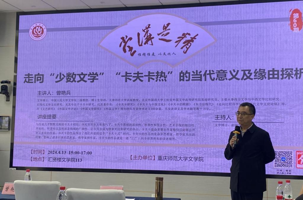 2024413日下午14:30,由文学院承办的M8870周年校庆系列学术讲座暨“精是讲堂”第60期在汇贤楼113报告厅举行。此次讲座邀请到了来自中国人民大学的曾艳兵教授,主题为“‘走向少数文学’——‘卡夫卡热’的当代意义及其缘由探析”。讲座由文学院熊飞宇副研究员主持,比较文学与世界文学教研室的老师、文学院的研究生及部分本科生参加了此次讲座。