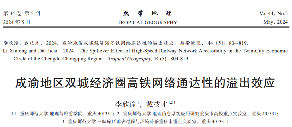 近期,我院人文地理学专业研究生李欣潼以成渝地区双城经济圈高铁网络为研究对象,基于最短出行时间、加权平均出行时间、日常通达性指数、引力模型和空间杜宾模型,探讨了高铁网络通达格局演化与其产生的溢出效应。研究成果以“成渝地区双城经济圈高铁网络通达性的溢出效应”为题发表在《热带地理》。GIS应用创新团队研究生李欣潼为第一作者,戴技才老师为通讯作者。