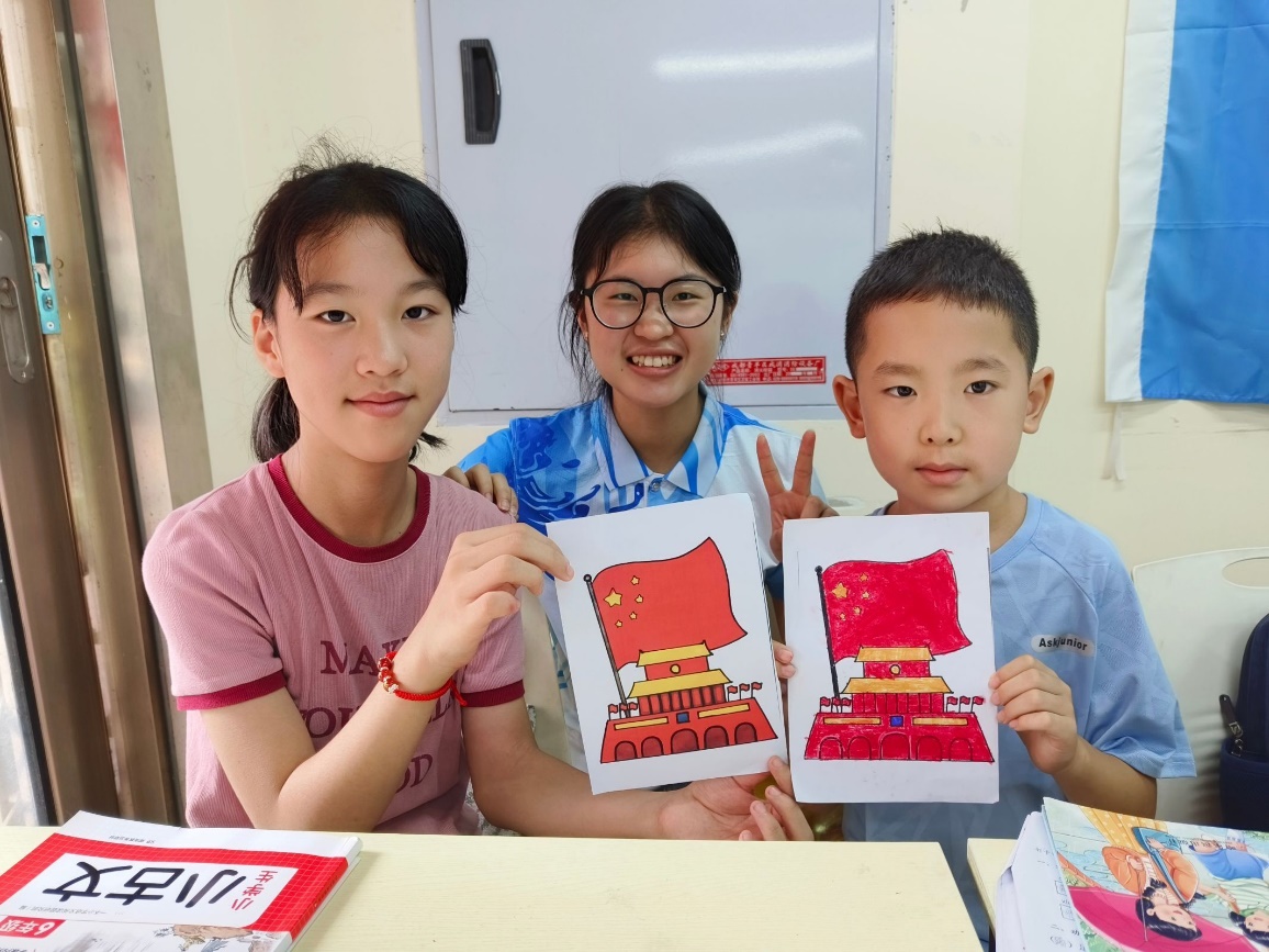 在活动中积极践行文化下乡,在社区内做好红色教育宣传,推动社区精神文明建设。团队成员聚焦少年儿童思想,引导孩子们基于革命历史自主创作,用画笔描绘出心中的伟大祖国,在妙笔生花中展现对祖国强烈而深刻的情感,将红色文化深植孩子们的心中。