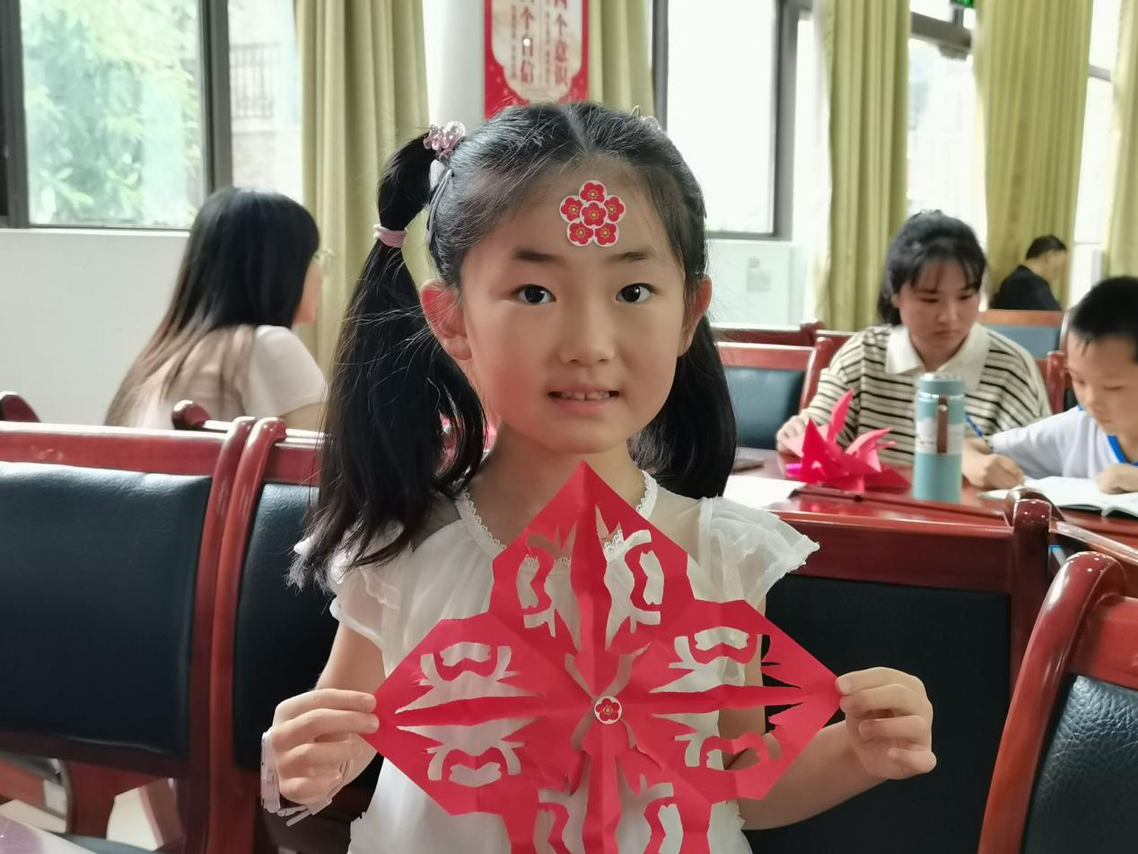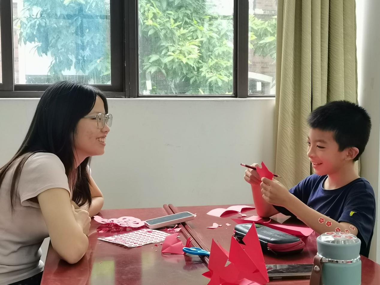 在完成对中国传统文化知识的讲解之后,志愿者先科普了我国剪纸艺术的来源并讲解了剪纸的方法,然后让小朋友在志愿者的带领下完成,不一会儿,所有小朋友都制作成功了各种各样的剪纸作品,还积极展示自己所制作的成果。