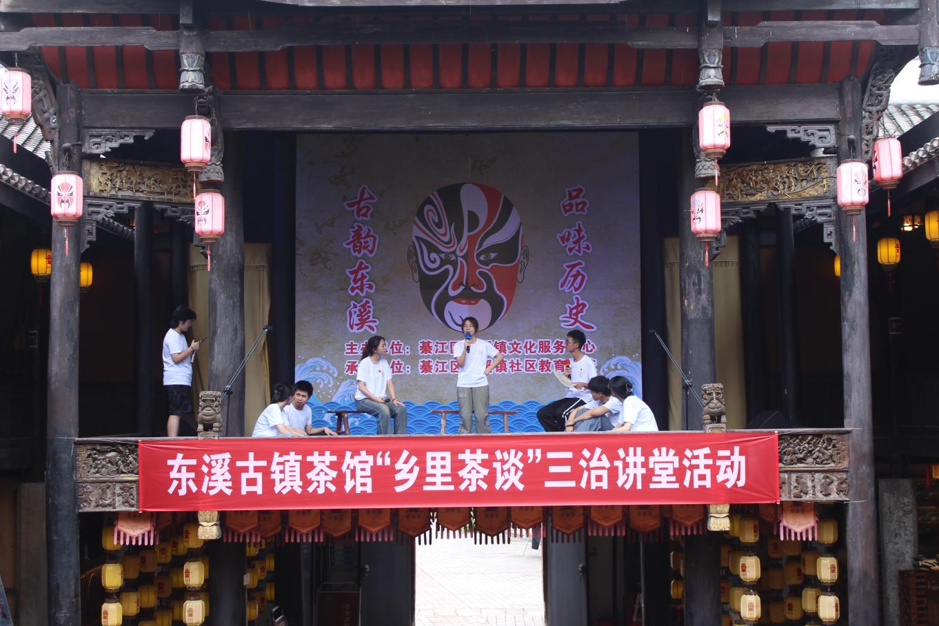 7月10日14时,实践团成员受东溪镇文化服务中心邀请,来到东溪古镇茶馆参加“乡里茶谈”三治讲堂活动,在表演中宣传防诈知识,展示青年风采,传递青春力量,为东溪镇的群众带来了一场别开生面的表演。