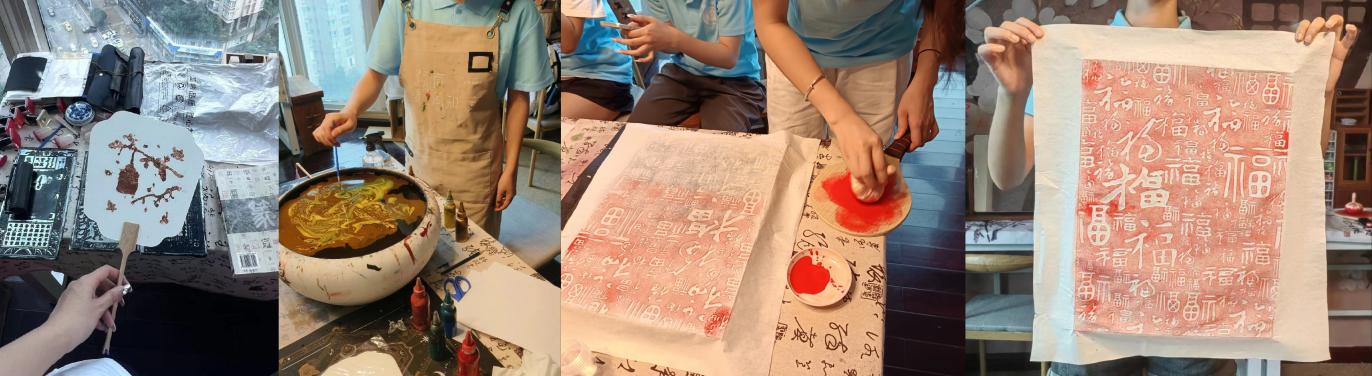 7月9日,实践团集体踏上重庆江北区南风知意非遗文化体验馆的探索之旅。在这个充满历史意蕴与文化氛围的体验馆内,成员们深入学习多样化的非遗文化知识,集体体验拓印艺术,共同完成了“福”字拓印,并在集体项目完成后,根据个人兴趣选择体验了以下不同的非遗项目:大漆团扇、烧箔团扇、国潮唐风石膏娃娃绘画以及珐琅掐丝书签制作。非遗文化体验馆内的教学老师耐心指导,从示范到实际操作,每一个步骤都精雕细琢,让成员们充分感受到,在非遗文化的传播过程中,一直有人在努力,在行动。最后,成员们还有幸采访到了体验馆的专业老师,深入了解他们对非遗文化保护与传承的独特见解。