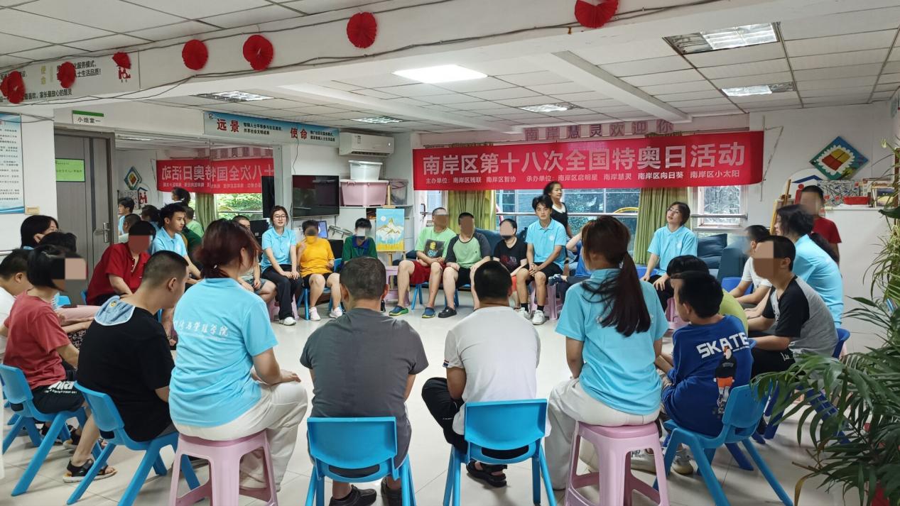 下午,慧灵机构开展南岸区第十八次全国特奥日活动。志愿队加入到学员们的活动之中,与他们进行亲切交流、亲密互动。活动中,志愿者了解到了他们对生活的乐观态度和单纯的内在心灵。今日特奥日活动分为障碍赛、投篮和拍球两个板块。学员在志愿者的引导和鼓励下顺利开展了活动,并探索到活动的妙趣。活动结束之后,机构老师告诉志愿者:“特教是一门需要细心和耐心的职业,只有和学员不断接触和交流,才能获得更深入的信任和友爱。”