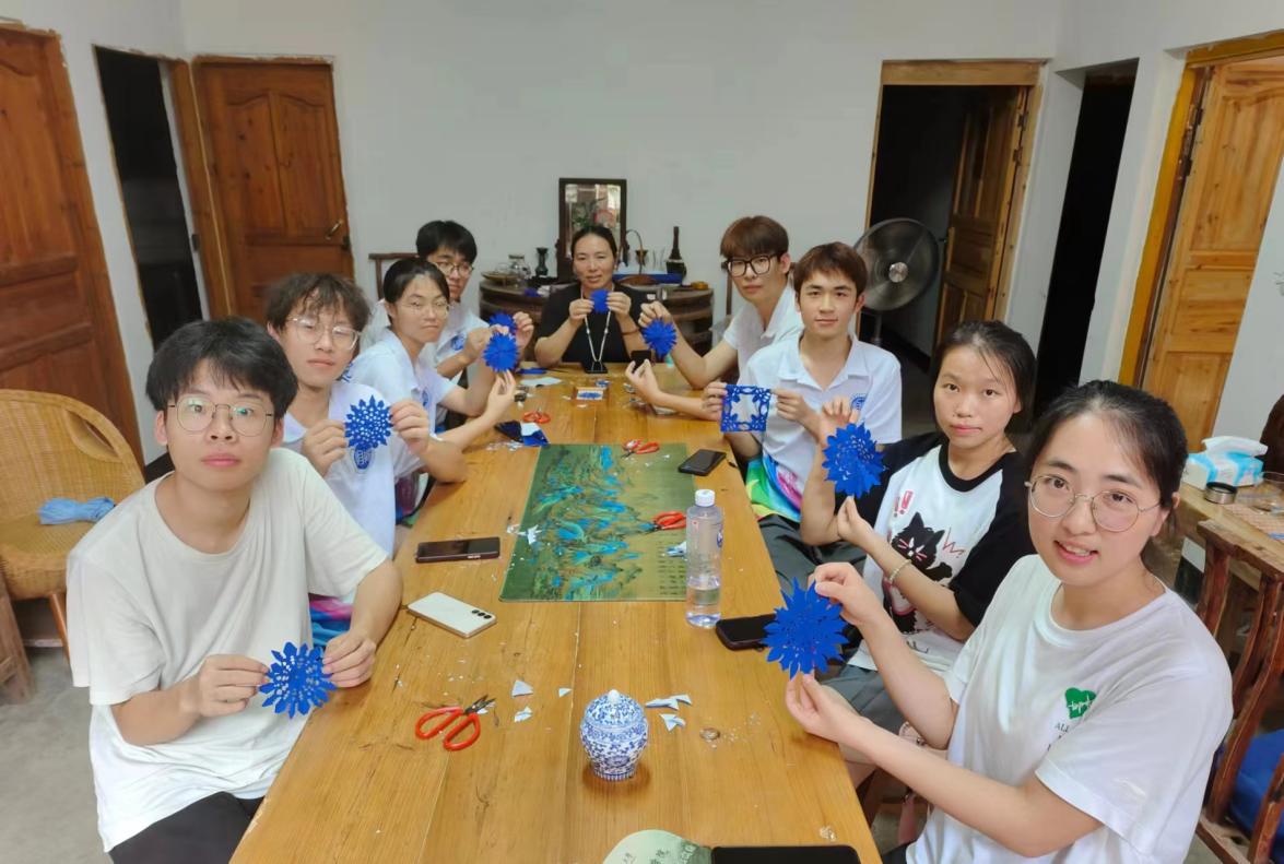 图为团队体验剪纸时与老师的合照