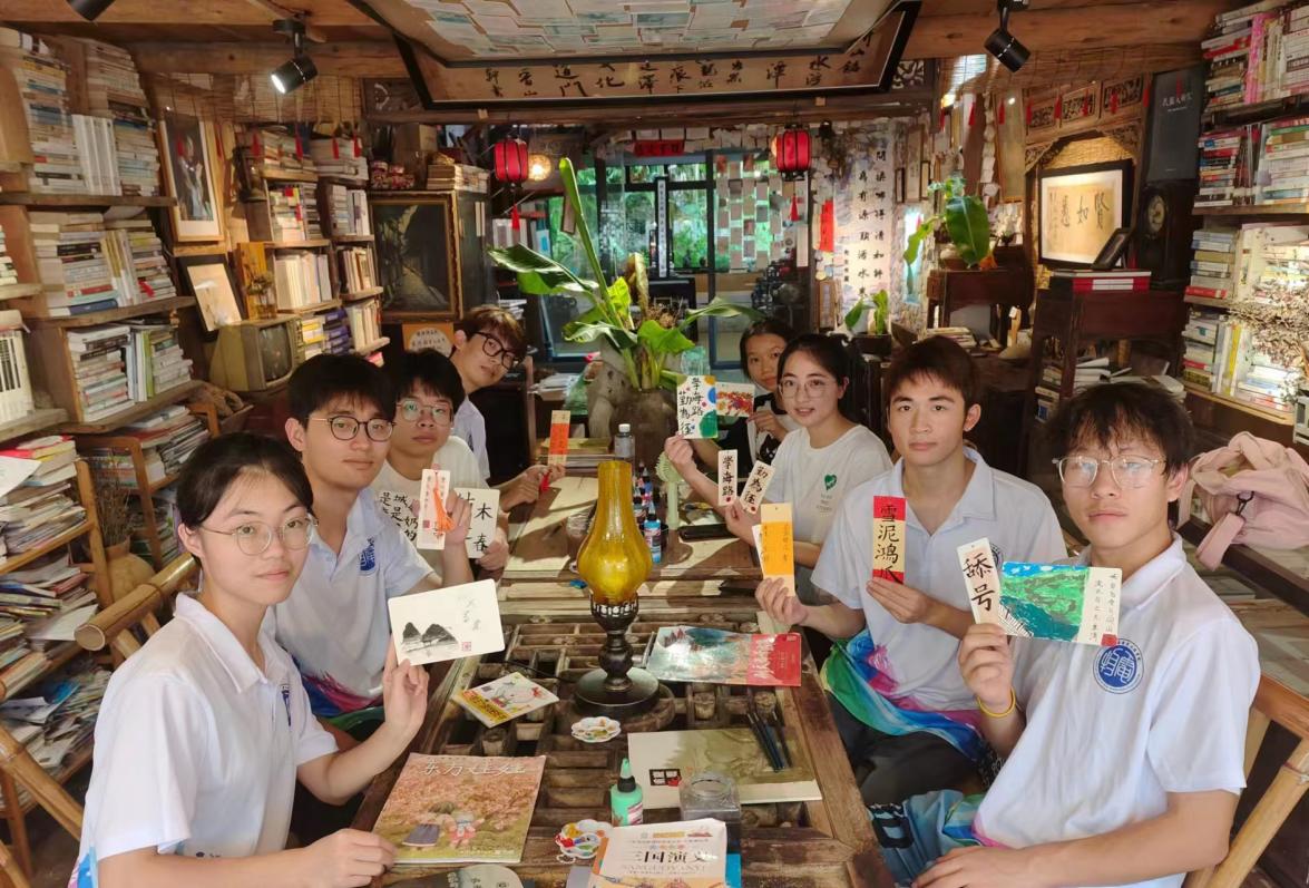 接下来,团队成员在先生书屋内开展了一场别开生面的文创制作活动。书法高手陈翰楚挥毫泼墨,在明信片上书写对龚滩古镇的深情厚谊;艺术爱好者陈玲则用画笔勾勒出非遗文化舞龙的生动画面;而书虫付莉钦则在书签上镌刻下“学海路,勤为径”的励志格言。 每一件文创作品都承载着团队成员对传统文化的敬畏与传承之心。戚老师对同学们的作品给予了悉心指导,并与大家合影留念,定格了这一美好瞬间。