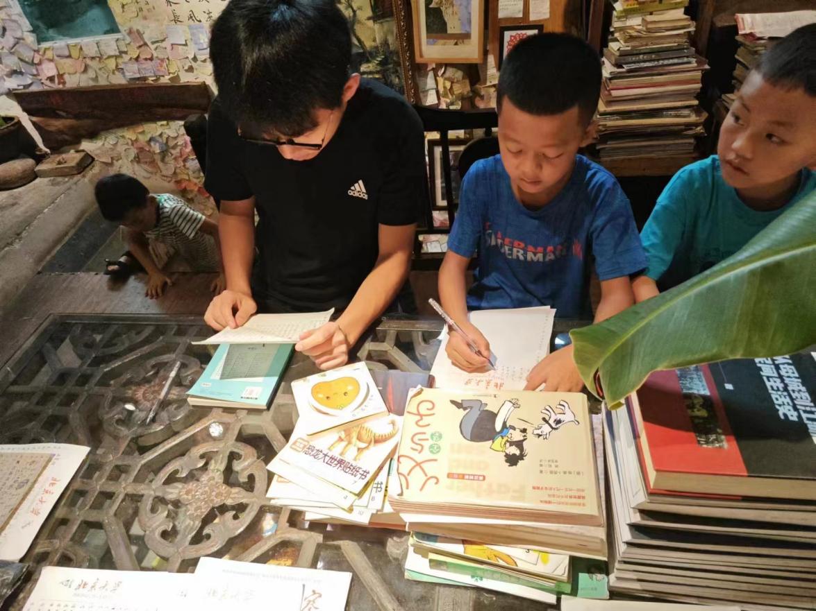 团队首先探访了古镇深处的“先生书屋”。书屋的红瓦青苔、石阶古韵,仿佛瞬间将人们带入了一个宁静致远的世界。在书屋负责人戚玉龙老师的介绍下,团队成员不仅了解了书屋的运营模式,还亲身体验了辅导学生练字写作的温馨场景。从幼儿园到初中的孩子们,在戚老师的耐心指导下沉浸在学习的乐趣中。团队成员付莉钦、刘杰帅等积极参与,他们与孩子们互动交流,激发孩子们对中华文化的兴趣与热爱。小朋友们纷纷表示,戚老师的教导让他们受益匪浅,不仅字写得越来越好,写作能力也得到了提升。