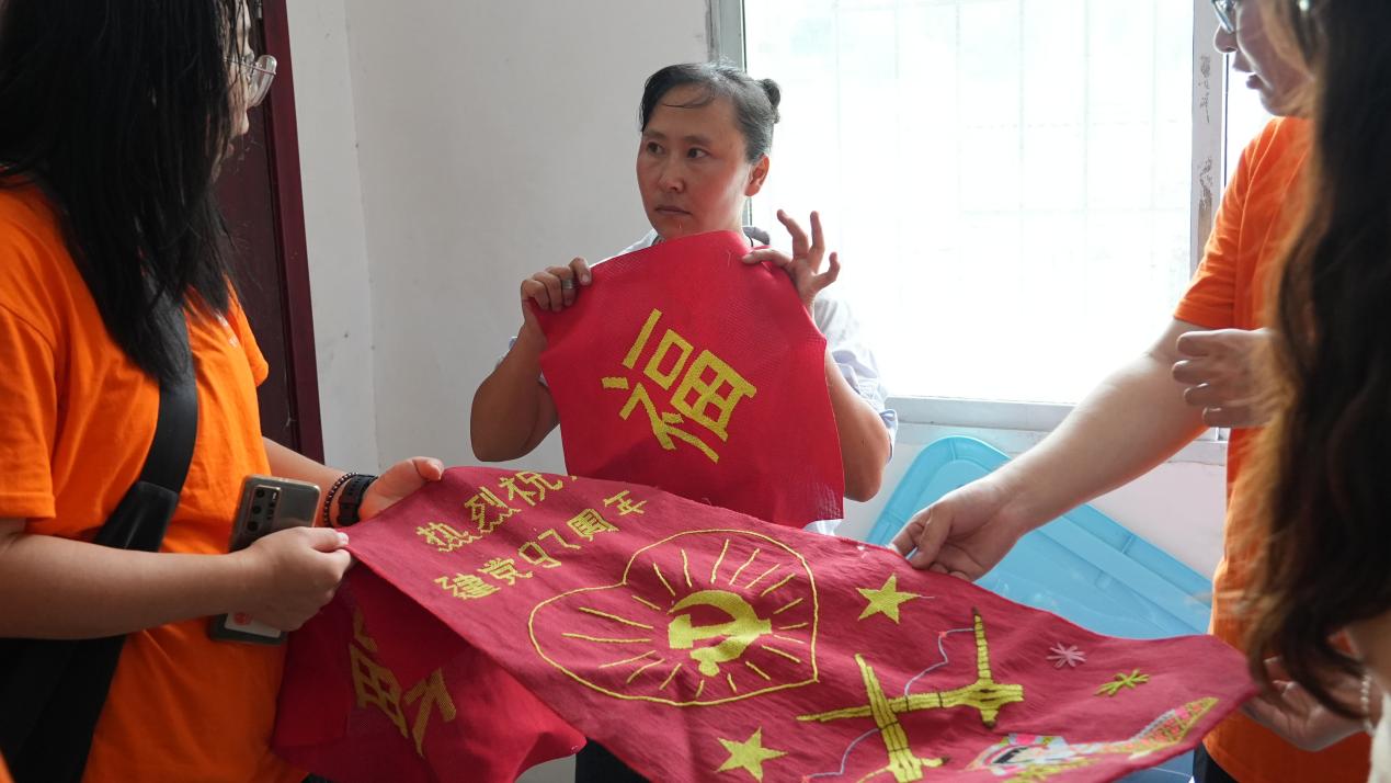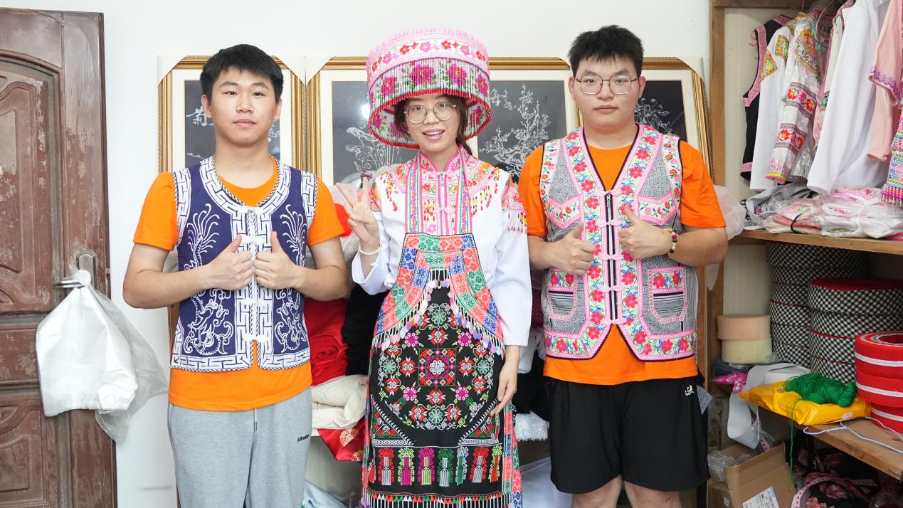 仪式后,熊兴树引领实践团成员参观了她的苗俗非遗工作室。这里,精美的苗绣作品与丰富的苗族文化元素交相辉映,展现着苗族人民的智慧与匠心。实践团成员们认真聆听熊兴树对苗绣、苗语、苗族芦笙等特色文化的介绍,并亲身体验了苗族文化的独特魅力。在参观过程中,一幅绣有“热烈祝贺建党97周年”的苗绣作品引起了大家的注意,熊兴树简要分享了这幅作品的创作背景与寓意,展现了苗族人民对党和国家的深情厚谊。