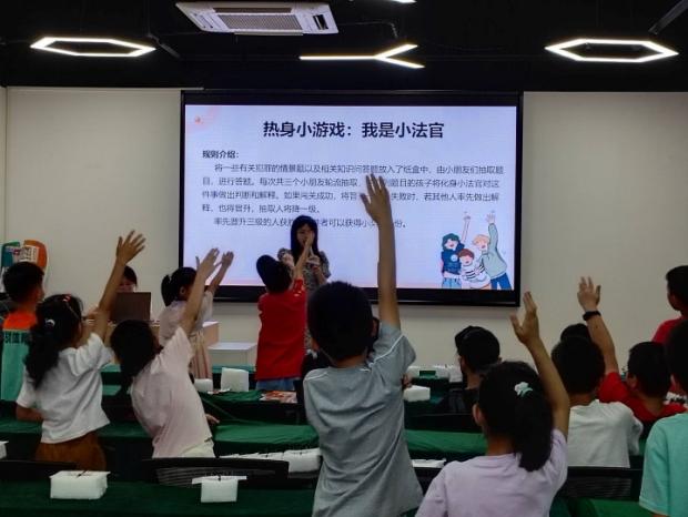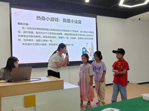本次课堂一共包括三个部分,首先是“我是小法官”的破冰游戏。志愿者们将一些有关犯罪的情景题以及相关知识问答的小纸条放入纸盒中,同学们通过抽取小纸条的方式来回答问题。课堂现场气氛非常活跃,同学们仿佛身临其境地体验了当时的情形,做出了正确的判断并且给出了答案的原因。在轻松愉快又扣人心弦的游戏氛围中,同学们深刻体会了宪法知识的在现实生活的体现,对现实生活中人门的活动做出了规范。通过游戏环节提高了青少年的儿童的法律意识,并且不产生枯燥情绪。