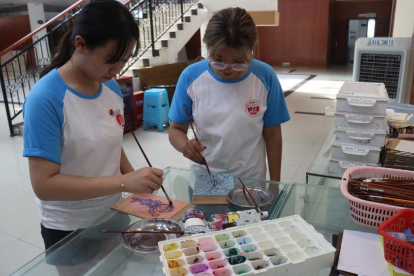 团队成员体验版画制作上色环节