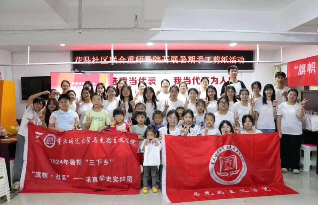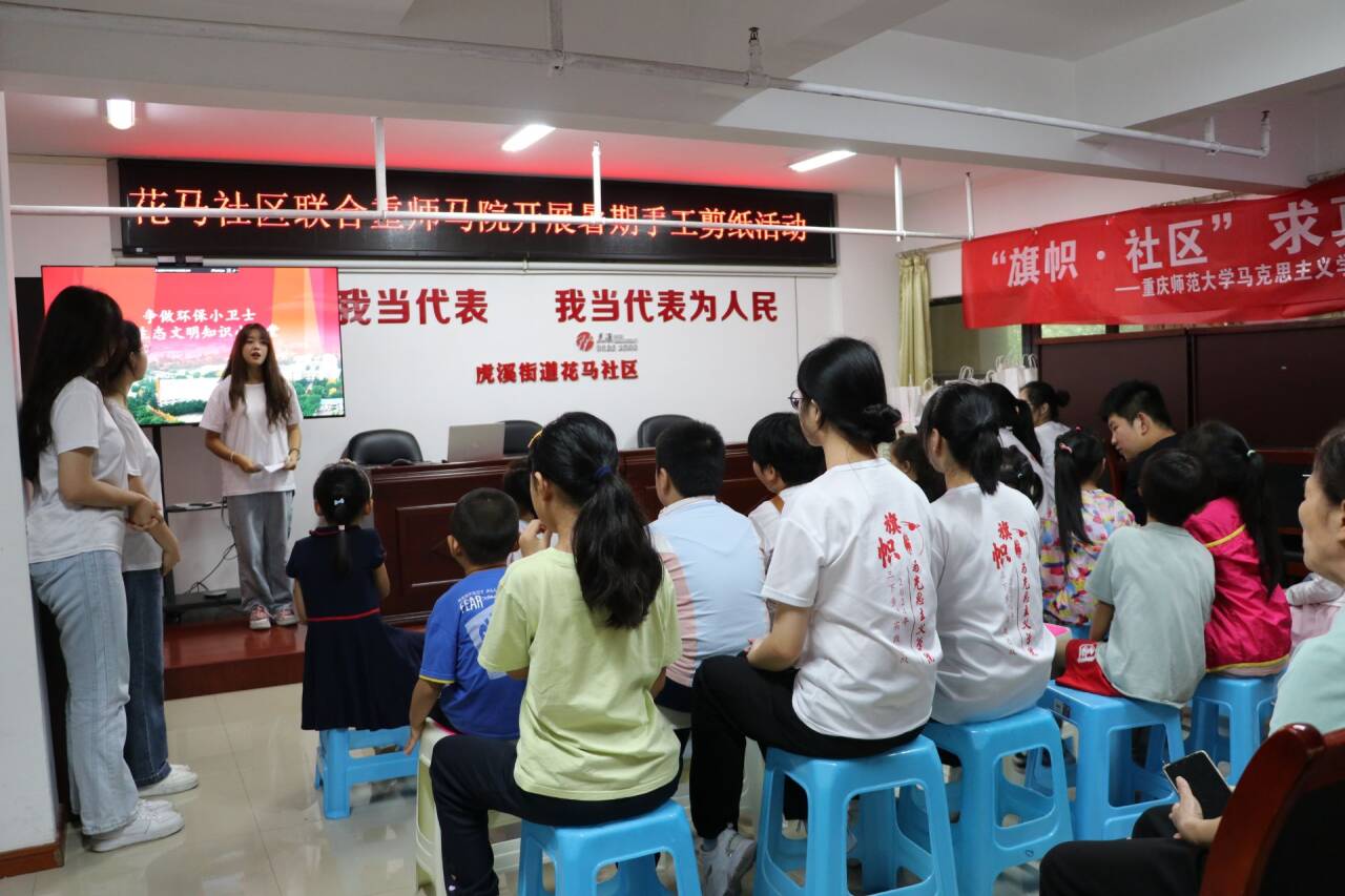 2024年7月11日,M88马克思主义学院“旗帜·社区”求真学史实践团在2021级本科生辅导员桑子豪老师的带领下,来到重庆市沙坪坝区花马社区开展暑期“三下乡”社会实践活动。通过开展环保主题团辅活动与手工剪纸课,实践团成员们与小朋友们亲切交流、暖心互动,在欢声笑语中播撒爱的种子。