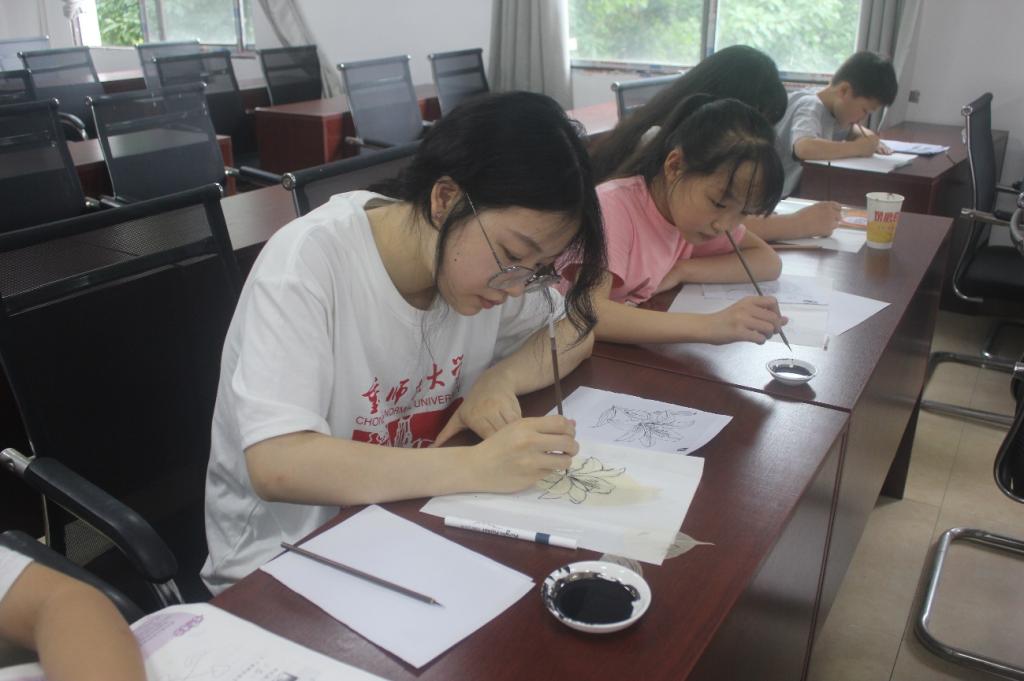 活动伊始,美院志愿者与学生们汇聚一堂,由此拉开了这场艺术探索之旅的帷幕。志愿者们以满怀的热忱进行了自我介绍,并向学生们揭晓了接下来教学的核心主题——叶脉画。为使学生们对即将接触的此项技艺有更为深入的理解,美院志愿者们率先引入了白描技法的学习。在洁白的宣纸之上,学生们手握毛笔,谨小慎微地勾勒着线条,力求达到流畅与细腻之态,初次尝试便展露了他们对艺术的敏锐觉察以及无限的潜能。