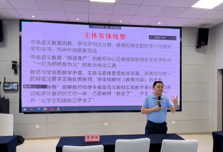 接着,李教授分别讲解了“教-学-评”一致的四个方面:主体一致、内容一致、过程一致和结果一致。他指出,“教-学-评”一致不仅关注语文知识和技能技巧,更要关注元认知能力、必备品格和价值观念。后者不仅制约前者的学习过程和效果,更决定前者能达到的高度,为坚定理想信念、厚植爱国情怀、加强品德修养、增长知识见识、培养奋斗精神、增强综合素质的“六个下功夫”明确了方向。