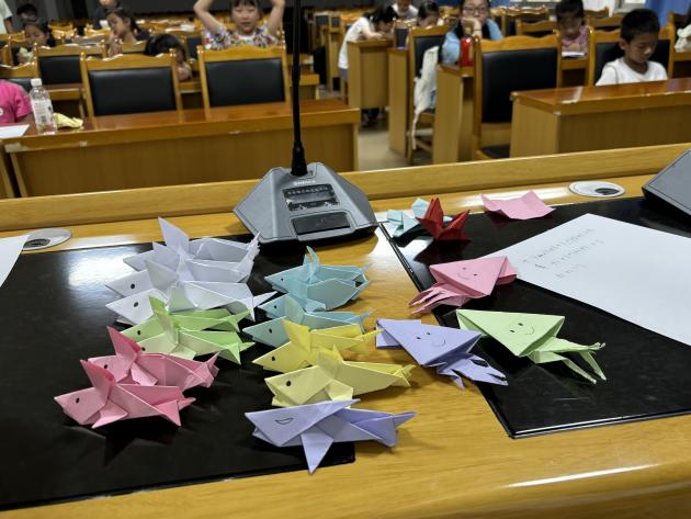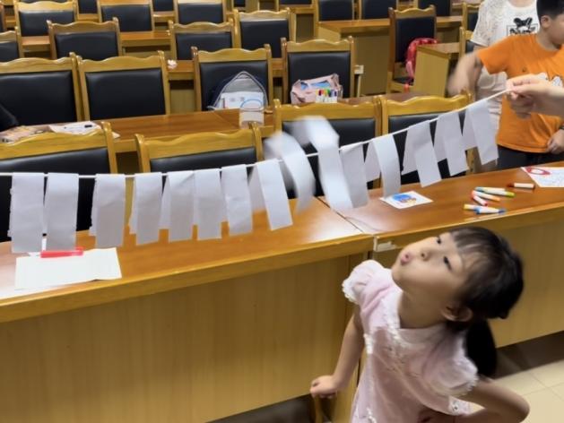 (图为小朋友们的折纸作品 拍摄者:黄悦煊) (图为“吹纸条挑战”游戏 拍摄者:谢炎余)