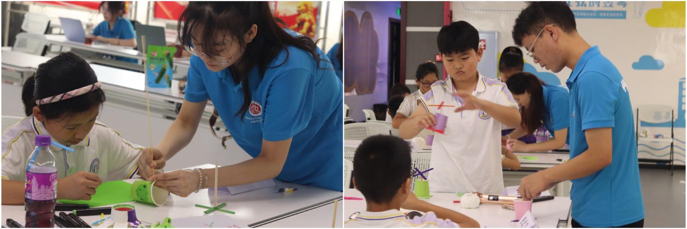 715日下午,“青春飞扬,逐夏而行”科普送教服务队2组,在荣昌科技馆中正敲锣打鼓,热烈纷呈进行着“半自动彩虹风车”的科学实践课,在这堂课中,科学与技术教育专业硕士研究生志愿者吴建昌带领孩子们既学习风力产生的奇妙力量,亦解锁制作风车的动手能力,学会如何制作一个彩色艳丽的风车国度。小小的纸杯、雪糕棍、吸管,在同学们的奇思妙想下,通过一双双“马良的神笔”,使得一幅幅创新独特的风车设计图跃然纸上。随风而起,纸杯成花,堆满颜色的彩虹小风车被同学们的“御风魔法”赋予生命,将所学知识与现实生活相结合,点燃了学科学、爱科学的热情。