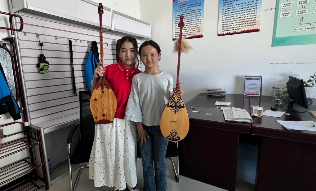 与此同时,实践团成员艾迪达尔·叶尔包拉提前往阿勒泰地区青河县与当地小朋友一同感受民族乐器的魅力。冬不拉是哈萨克族的传统弹拨乐器,具有悠久的历史和丰富的文化意义。冬不拉的音色优美,音量虽不大但具有丰富的表现力,适合自弹自唱、独奏及乐器合奏等多种演奏形式。它的演奏技巧包括弹与挑,一般弹用于重拍,挑用于轻拍,可以形象地表现草原上的自然景色和哈萨克族人民的生活。