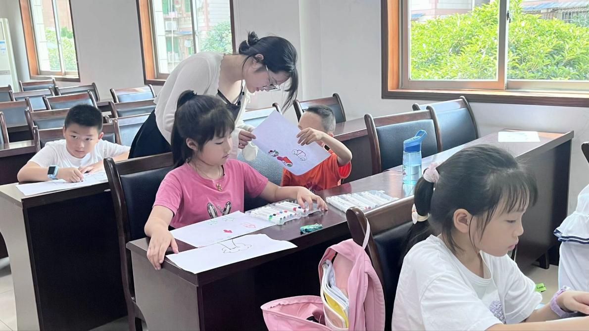 图为志愿者潘映桦带小朋友分享绘画作品 陈姿伊摄
