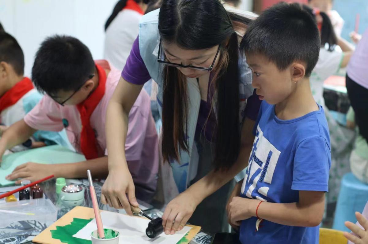 (图为团队成员指导小朋友制作版画)