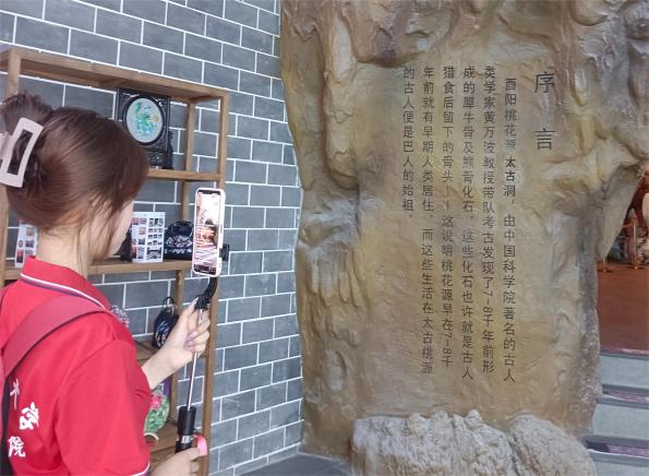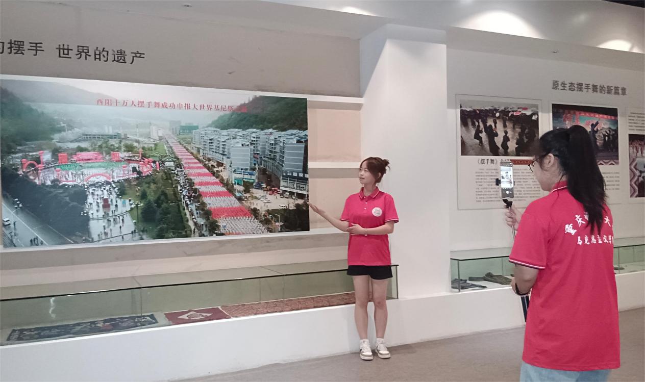 下午15:20,实践团成员陈丽莎和李堂炎在重庆市酉阳土家族苗族自治县民族博物馆进行了线上直播,从民族团结、历史遗古、古镇风情、酉阳名人和土家摆手舞五个部分展示了土家族苗族的特色,介绍了当地少数民族的饮食、服饰、节日习俗等。