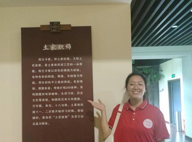 下午14:30,实践团成员阮黔明在重庆市黔江区的重庆市博物馆开展线上直播,介绍了土家族在武陵山区的地理分布、土家族的方言,以及名为“西兰卡普”的特色工艺、摆手舞、哭嫁婚俗等土家族的风俗习惯和土家族著名的建筑特色——吊脚楼。同时还宣传讲解了我国的民族政策。