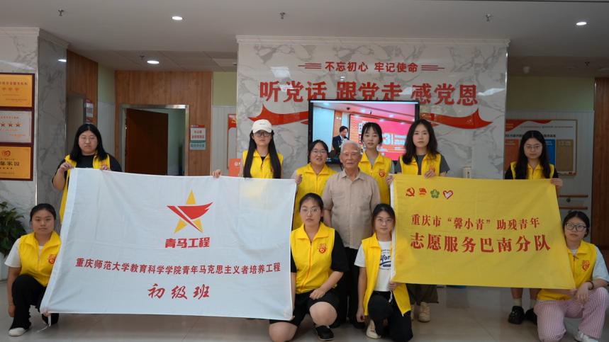 在这个骄阳似火的夏天,为了让大学生在文化下乡的浪潮中发挥积极作用,促进他们按照先进生产力发展的要求成长成才。2024年7月19日,重庆市“馨小青”助残青年志愿服务M88分队(以下简称“团队”)携手M88译心手语翻译团队、教育科学学院青马初中级班及团委学生会成员,在指导老师段瑞林的带领下,踏上了前往巴南区中粹疗养院的旅程。此次活动以“红歌回荡,岁月情深,科普启航,生物梦”为主题,参与人员包括吴晓娟、李金星、王锦英等。