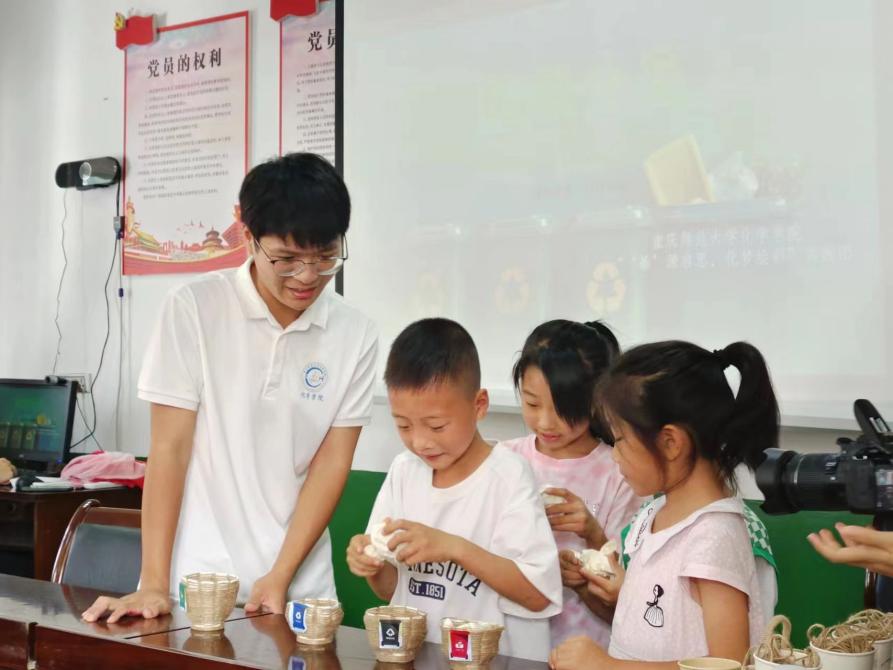 中国式现代化是人与自然和谐共生的现代化。为深入贯彻新时代中国特色社会主义习近平生态文明思想2024年7月15日M88化学学院“‘綦’源启思,化梦绘彩”实践团来到重庆市綦江区永新社区进行“三下乡”系列活动,针对该社区的中小学生,实践团精心设计了“垃圾分类小卫士”与“绿色创意手工坊”两门启发性与实践性的课程。