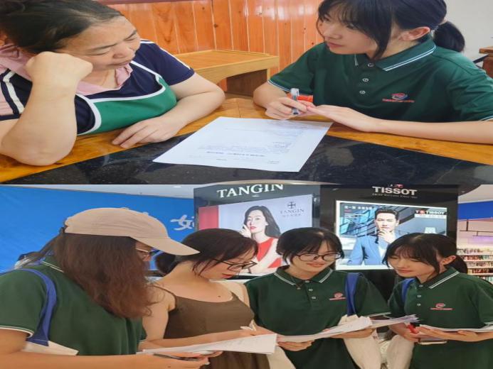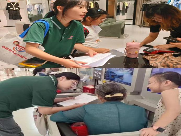 联系群众,以小带大,共筑普通话梦。实践团成员分组在购物中心随机访谈不同年龄、不同职业的市民,聚焦个人普通话应用水平、学习普通话意愿、当地普通话情况以及自身对普通话看法等方面进行深入了解。此外,实践团成员对被访谈的小朋友进行了基本的普通话培训,并邀请他们作为小小采访者与商城顾客进行交谈,帮助他们在采访过程中规范普通话发音和增强沟通交流能力,以小带大,引领家长和市民积极认识到普通话的魅力和重要性。