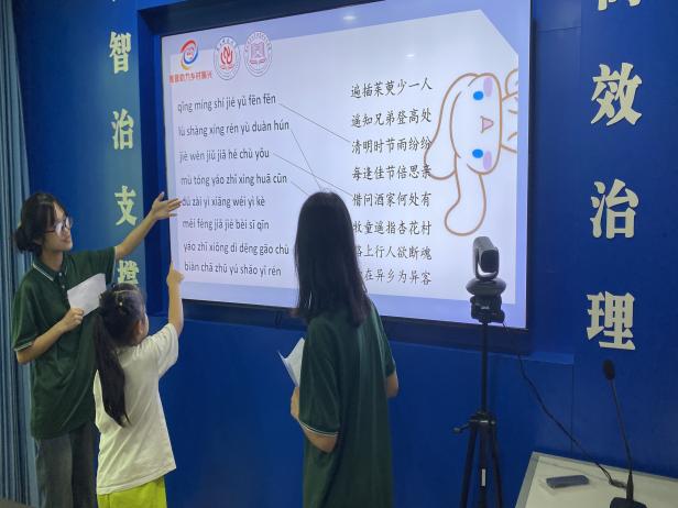 在“成语连环计”环节,小朋友们通过给出的成语图片,猜出相应的成语并用自己的话口述这个成语背后的故事,在感受成语魅力的同时锻炼小朋友们的普通话表达能力;在“诗词大挑战”中,各位小朋友在各位小老师的带领下,学习诗词的正确读音,并了解蕴含在诗词背后的传统文化,在学习完诗词的读音后,小朋友们将拼音与对应的诗词进行连线,通过这种方式,小朋友们不仅增强了自身普通话运用能力,还深刻感受到诗词文化的独特魅力;在环节“动画讲礼貌”中,小朋友先观看动画片片段,之后在实践团成员的引导下对该动画片片段进行普通话配音,以这种寓学于乐的方式提升小朋友们说普通话和用普通话的能力。