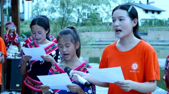 图为实践团与当地孩子合唱歌曲《虫儿飞》现场