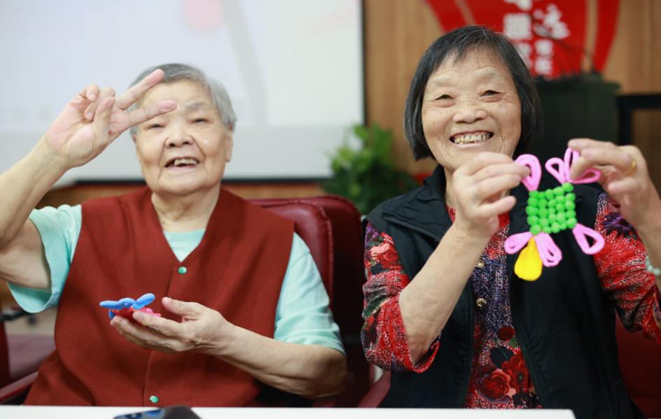 活动伊始进行了《关键词拍拍乐》热身游戏,老人们在志愿者的引导下积极参与,点燃了现场欢乐的气氛。紧接着,活动进入了粘土制作环节。志愿者们事先准备了一系列精美的粘土成品作为展示,瞬间吸引了老人们的目光。在志愿者的耐心讲解与示范下,老人们开始了他们的创意之旅——制作中国结,这一承载着中华民族深厚文化底蕴的手工艺品。志愿者或俯身解答老人的问题,或手把手地教老人制作粘土作品。从粘土的揉捏技巧到中国结的形状塑造,志愿者们都尽己所能帮助老人。