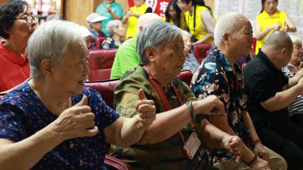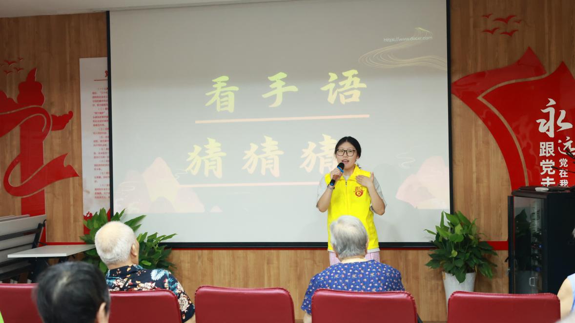 课堂开始,主持人先带领老人们进行了一场根据手语猜地名的小游戏,从大家所熟悉的重庆,再到首都北京,老人们都积极举手参与竞猜。老人猜对答案后,主持人则向老人们解释这些地名为什么用这样的手语表示,并讲解其背后的含义。老人们对手语在生活中的应用颇感兴趣,纷纷举手说出新的地名,请教主持人其对应的手语表达。接着,主持人带领老人们学习了手语舞《唱支山歌给党听》,这首大家耳熟能详的红歌勾起了老人们年轻时候的回忆,老人们都目不转睛地跟随主持人学习每句歌词对应的手语动作,和台下的志愿者们一起边唱边跳,沉浸其中。最后,主持人和志愿者们一起给老人表演了手语舞《团结就是力量》,在载歌载舞的欢笑声中,大家一起给这一堂课画上了圆满的句号。