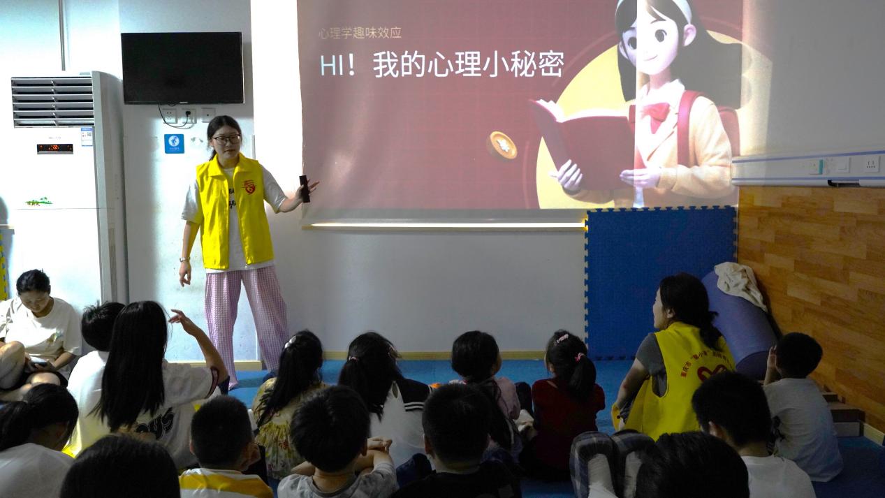 课堂伊始,志愿者老师讲述了一些有趣的心理效应,成功地吸引了小朋友们对心理学浓郁的兴趣。紧接着,老师迅速展开了《我知道你在想什么》和《注意!颜色对对碰》这两个妙趣横生的小游戏。在欢快音乐的带动下,小朋友们展开了激烈的竞争,他们的欢声笑语在空气中回荡,每一个孩子都深深体会到了心理学所蕴含的无尽奥秘与独特趣味。最后,志愿者老师引领着小朋友们安静地观赏了一部充满温情与治愈力量的动画短片,短片讲述了一座小山从感到自卑,觉得自己不如别的大山高大、丰富,到后来认识到自己的价值和独一无二,最终认识自己,接纳自己的过程。孩子们都深切领悟了其中“学会欣赏自己,愿我们都能成为自己”的大道理。