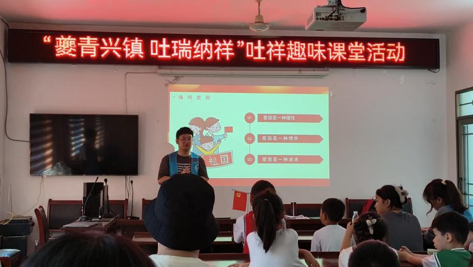 接下来,团队成员舒麒升面向孩童主持开展了爱国主义教育,先后从“爱国内涵”“缘何爱国”“如何爱国”对“爱国”这一概念进行深入浅出地系统性阐释。尔后,团队成员王汉滨、黄亦乐先后讲述了自己对于爱国的想法,教导孩童们坚定理想信念、弘扬爱国主义,成长为一个不负自己、不负家国的大写的人。