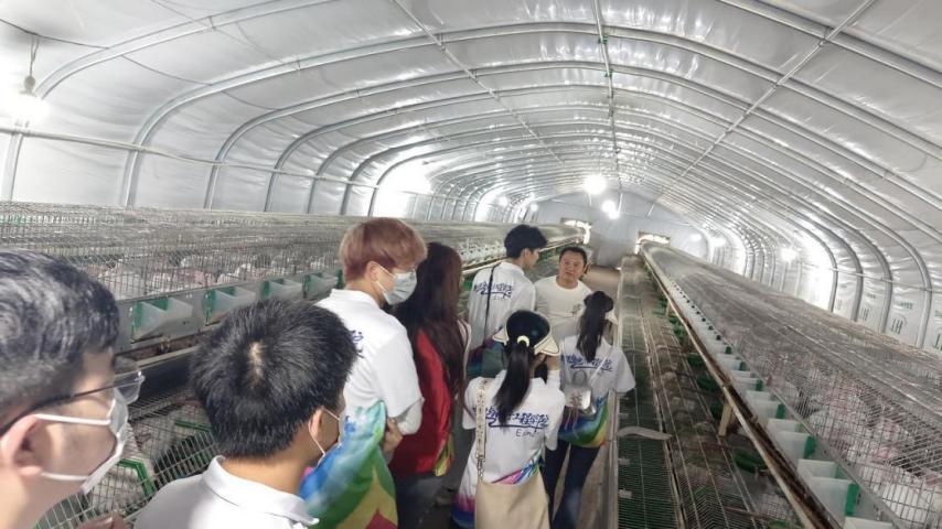 谭天贵为团队成员介绍本基地肉兔产业发展情况(任静怡供图)