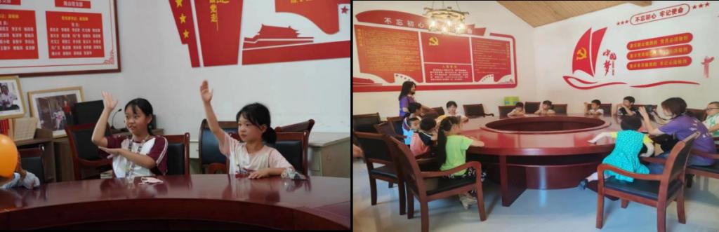 图为“击鼓传花”破冰游戏活动现场照片和“中坝村里有什么”小朋友积极回答的活动场面