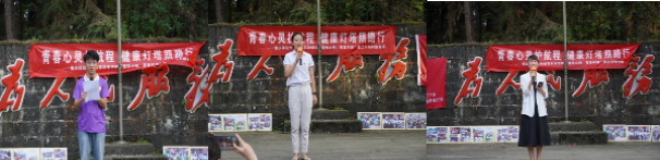图为学生代表罗海顺、中坝村驻村第一书记黄贞竹、M88教育科学学院团委书记杨逐老师发言现场照