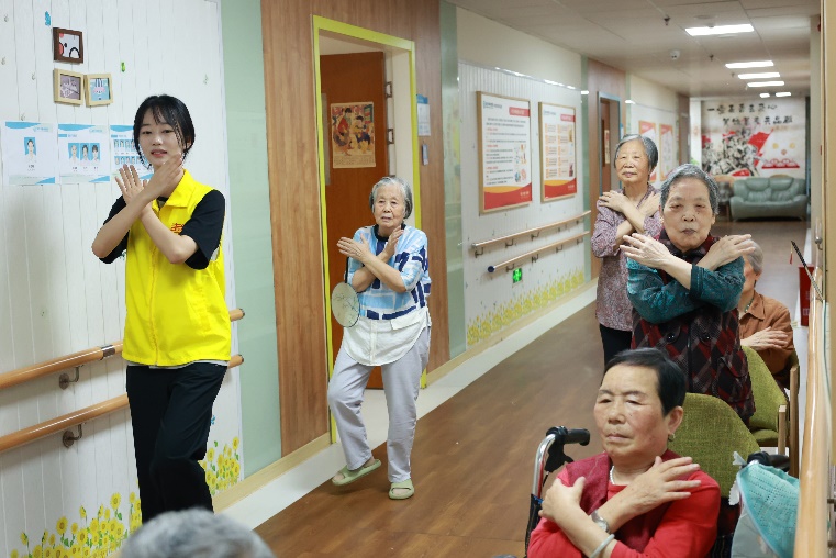 图为C区养老三楼志愿者带动老人舞动 作者:罗文汀