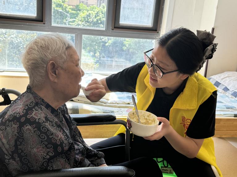 图为C区养老二楼志愿者服务失能老人吃食 作者:王锦英