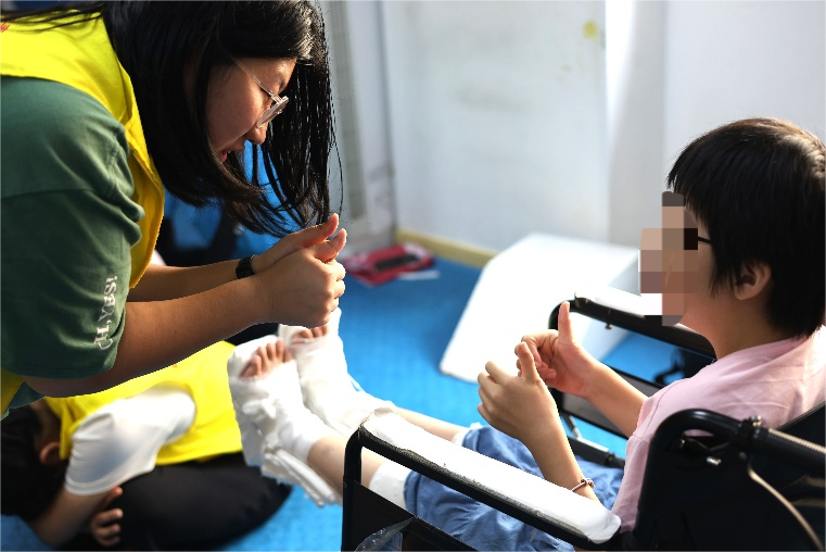 上午,团队分为三支小队,分别前往护养B区、C区、D区。下午,团队到达中粹护理院儿童康复中心(以下简称“康复中心”)对肢体残障儿童(腿部矫正)开展手语课教学。