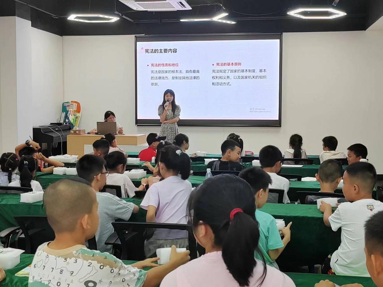 接下来,正式进入法治宣讲内容,结合社区青少年年龄及其认知水平,不能直接向社区青少年讲述宪法的定义、功能及地位,而是以社区青少年生活中熟悉的规章制度作比简单阐明宪法是什么以及地位,让社区青少年初步认识到了宪法是国家的根本法,具有最高的法律效力,是制定其他法律的依据。