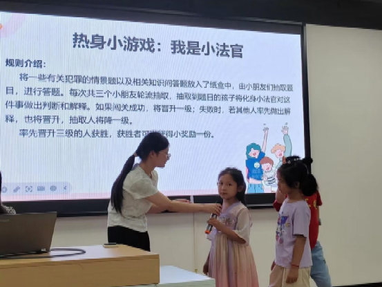 活动伊始,团队主讲人先阐述了提高青少年法治意识的重要性,再以小游戏—“我是小法官”,帮助社区儿童了解法律知识的积极性,同时,也促进团队志愿者与社区儿童的交流。