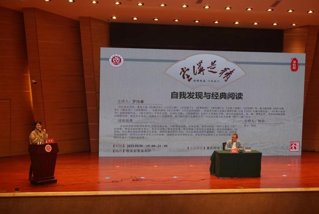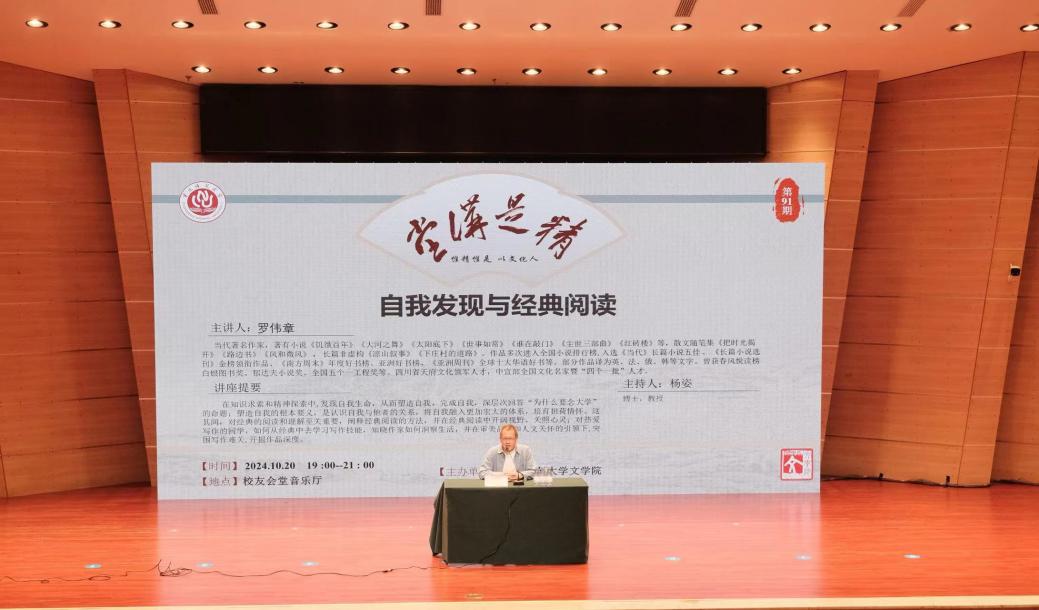 2024年10月20日晚,由我院承办的M8870周年校庆系列学术讲座暨“精是讲堂”第91期“自我发现与经典阅读”在校友会堂音乐厅举行。本期讲座邀请到了我院85级杰出校友、当代著名作家罗伟章先生主讲,讲座由文学院杨姿教授主持,文学院党委书记税强、教师代表郭大章等参加,400余名校内外师生济济一堂聆听讲座。