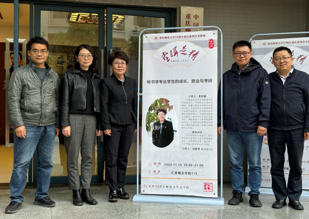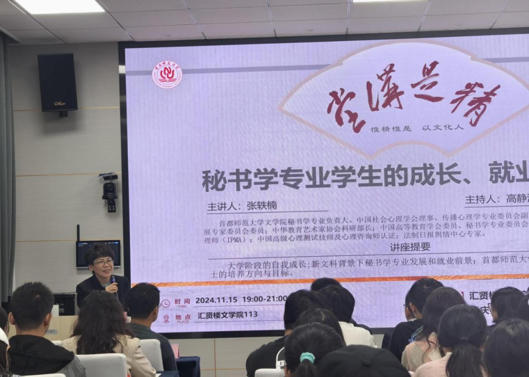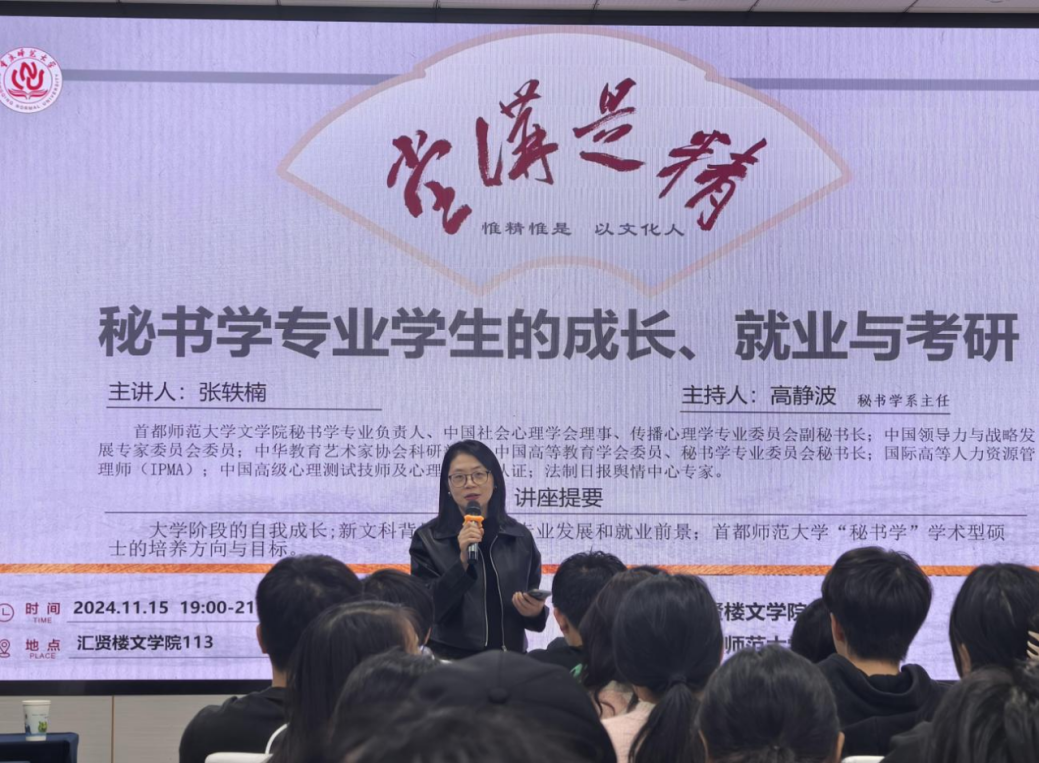 2024年11月15日晚,由我院承办的M8870周年校庆系列学术讲座暨“精是讲堂”第108期在汇贤楼113会议室报告厅举行。本期讲座特邀首都师范大学文学院秘书学专业学科负责人 张轶楠副教授主讲,题为《秘书学专业学生的成长、就业与考研》。汤克兵、管继锋、付冬生等教师代表,以及22级、23级秘书学专业本科生到场聆听。文学院秘书学系主任高静波主持讲座。