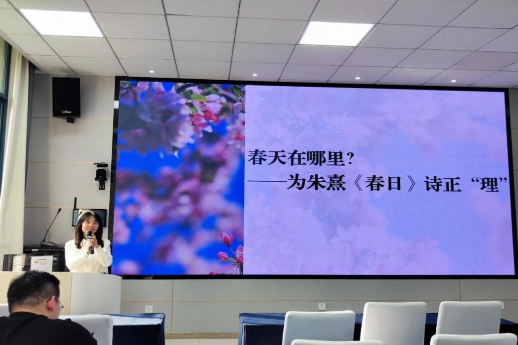 紧接着,古代文学教研室的何素婷老师进行教学示范,她主讲题目是《春天在哪里——为朱熹〈春日〉诗正“理”》。何素婷首先通过梳理当前网络平台和本科生教材配套作品选中对该诗解读的多种观点,指出其中存在的解读趋同、含混等现象,在此基础上她提出了一个尚未被解决的问题:朱熹《春日》诗的“理趣”何在?接着,她进行文本细读,指出了诗中有一处矛盾,即“一时新”(不认识)与“等闲识得”(容易认识)之间的语义矛盾。如何理解这一矛盾呢?何老师认为答案在“万紫千红总是春”一句中,因为朱熹认为新春的“万紫千红”虽然是新面貌,让人陌生,但换了新面貌的它们仍旧是认识春天的依据,故春天可以“等闲”识得。通过纷繁变化的“万”与“千”来判断稳定不变的事物本质,这就是朱熹理学思想中的重要内容——“理一分殊”学说。朱熹这一学说是对北宋理学家程颐“理一而分殊”理论的发展,其重要突破在于将这一理论从伦理领域推衍至自然科学领域,即自然界的万事万物也都遵循一个理,理是万事万物运转的原则和规律,反之,我们也能够从纷繁的“万千”现象中,通过格物致知,来认识这个稳定的“理”。何老师又引入朱熹的“谷种之喻”来加深对“理一分殊”的理解。通过文本和理论的分析,何老师得出结论:《春日》是写景诗,是抒怀诗,但更是一首言理诗;《春日》所言之理是“理一分殊”。课堂最后,何老师将《春日》诗的解读作为一个范本,启发学生应该看见言理诗的独立历史和审美,并理解朱熹是言理诗发展中的重要一环。